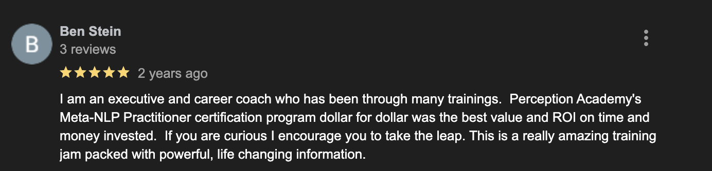 “Partaking in the Perception Academy’s NLP Practitioner Certification program unveiled skills and insights I didn’t know were possible. The power of the human mind is boundless, and this course took me on a sojourn to the infinite limits of the powerhouse that is my mind. I cannot imagine an instructure, teacher, facilitator and coach more qualified that Jason Schneider to lead a person on this path to coaching, personal development, and many other useful skills. I have never met anyone with such an abundance of expertise, versatility, and ingenuity as Jason. Most importantly, Jason is kind, warm and approachable with a great sense of humor to boot, and I am so glad that I had him and my delightful cohort to support me on this amazing odyssey of Perception Academy’s Neuro-Linguistic Programming Practitioner Certification program.” – Steven Laskin, Writer