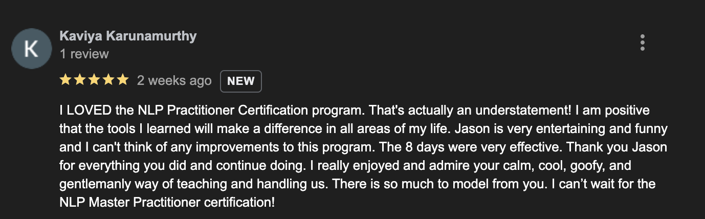 “After meeting him and taking the course, Jason solidified that I made the right choice. Jason connected to each person in the course, modeling what he was teaching. This is important to me because the teaching only carries the integrity of the teacher. Jason’s integrity, passion and ability to deliver were on point. When making an investment I look for my ROI (Return on Investment) and I was satisfied before I was half way through! There’s no question to me that what I learned was priceless and useful to me. I now have more tools to understand both myself and others, allowing me to communicate more effectively. I highly recommend this NLP Practitioner certification program!” – Willow Green, NLP Practitioner & Coach